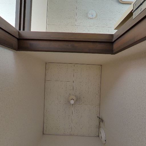 換気扇と天井点検口の状態(確度64%):天井に換気扇と点検口があり、点検口周辺に軽い汚れやシミが見える。
