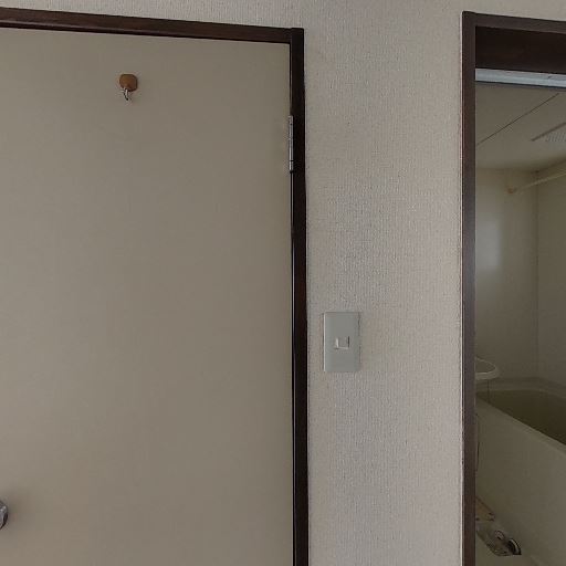 玄関と水回りのレイアウト(確度78%):玄関周辺はコンパクトで、右側に棚状のニッチ、左手に浴室が位置。窓があり採光・換気が可能。