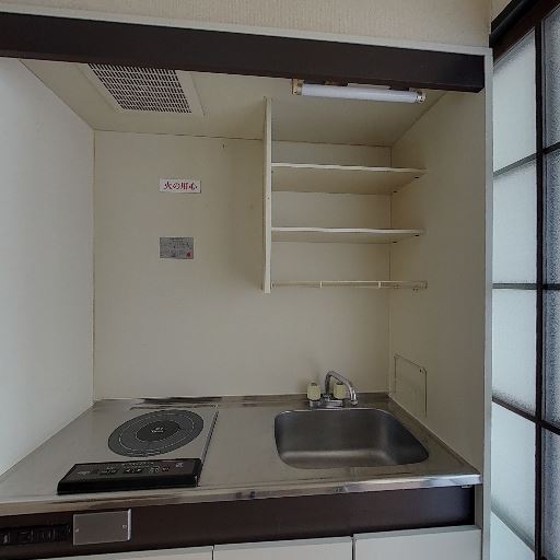 キッチンの設備(確度86%):1口のIHコンロと小型換気扇、シンク。吊り棚とオープン棚があり、調理スペースは最小限。