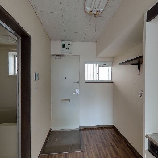 玄関扉と電気盤の位置(確度84%):玄関すぐ上部に分電盤があり、扉は内開き。ポスト口付きでコンパクトな玄関まわり。