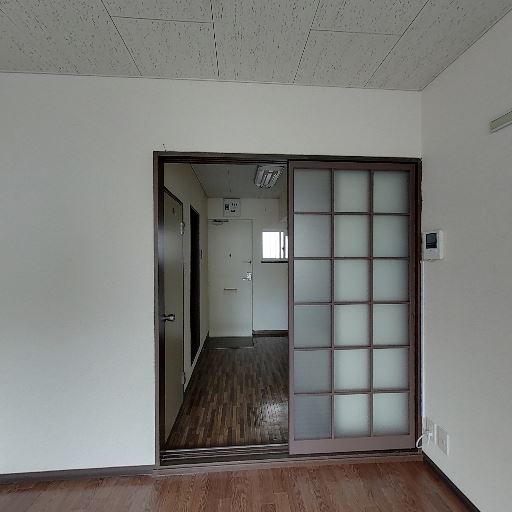 和洋折衷の建具(確度78%):すりガラス格子の引き戸と、別方向には和紙風の引き戸がある。