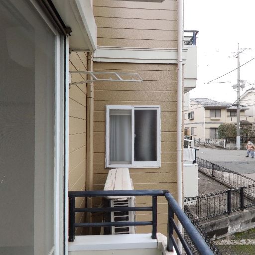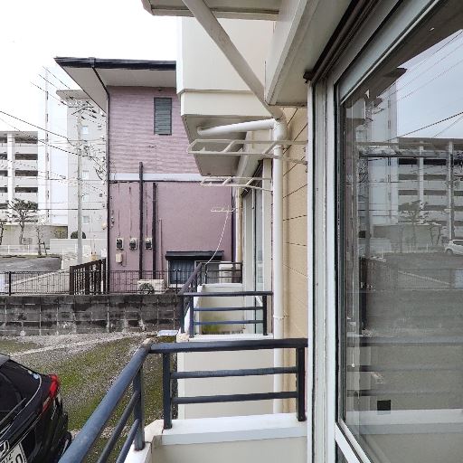 バルコニーに物干し金物あり(確度86%):手すり内側と壁面に物干し用のフック・金具が設置されている。