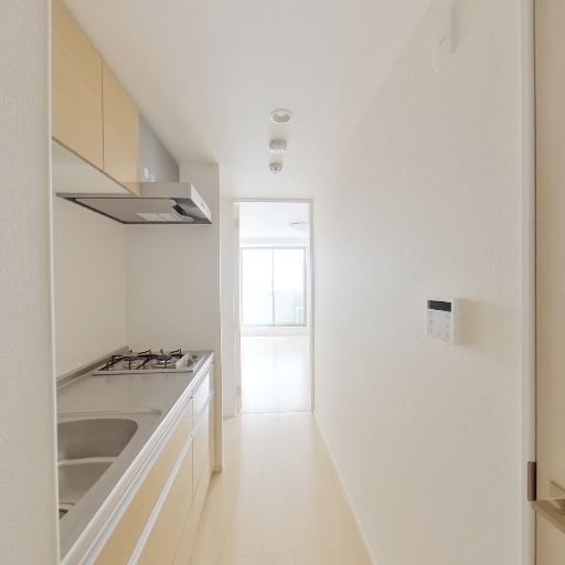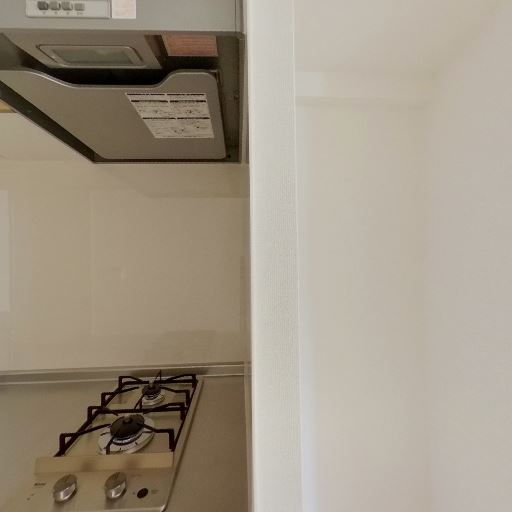 • キッチンの設備と清潔感(確度86%):2口ガスコンロとシンクがあるシステムキッチンで、全体的に清潔。レンジフードや収納も見える。