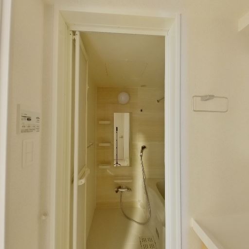 • 浴室はシャワー・鏡・棚付き(確度80%):浴室にシャワー、縦長ミラー、収納棚が見える。清潔感のある明るい内装。