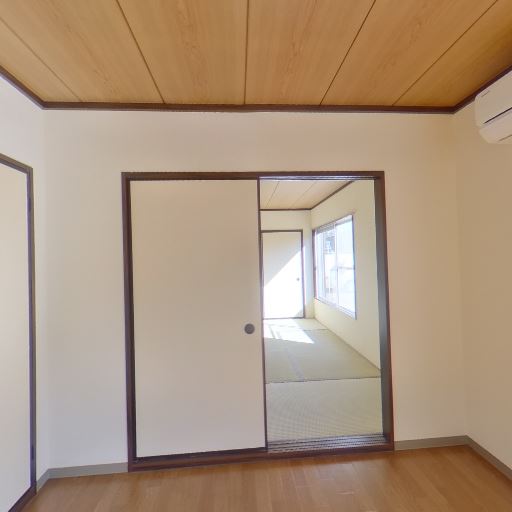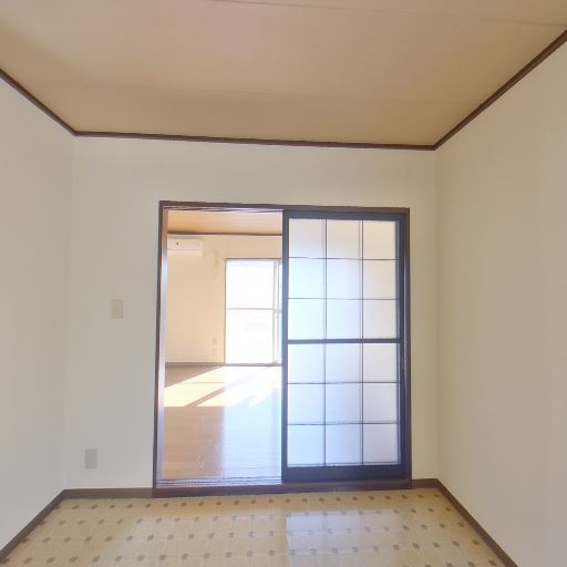 隣室との続き間(確度78%):ふすま開口の先にフローリングの明るい部屋が続いている。