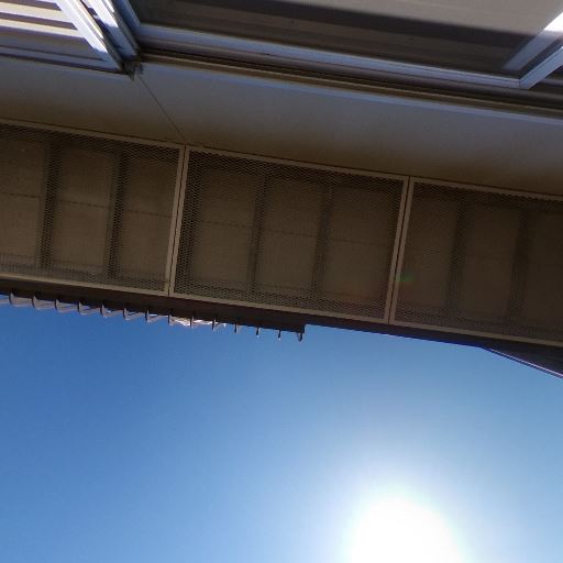 日当たりの良さ(確度82%):強い直射日光が差し込む環境で、屋外スペースが明るく照らされている。