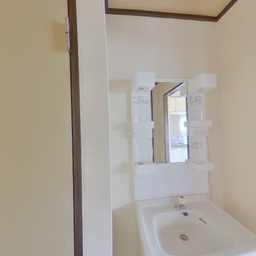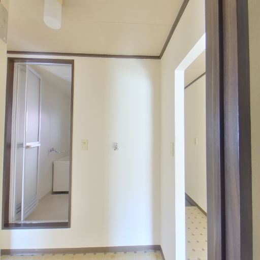 洗面脱衣所の存在(確度90%):洗面台と鏡、浴室入口が見え、洗濯機置場もあるため洗面脱衣所の一角と判断できる。