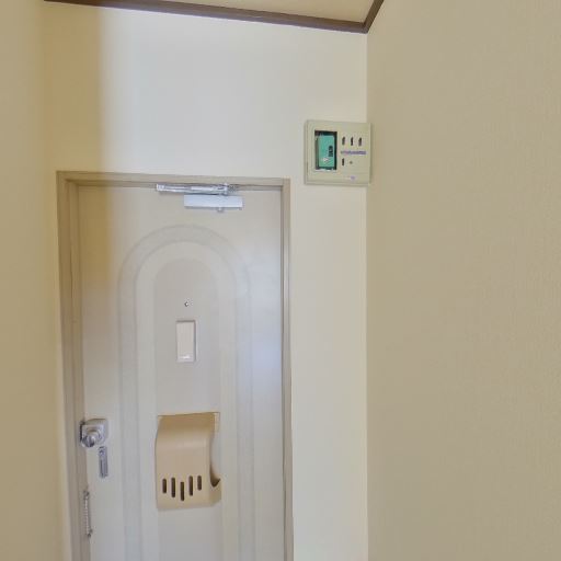玄関まわり(ドアとインターホン)(確度71%):玄関ドアと室内側のインターホン/チャイム盤が確認でき、共用廊下側に面した一般的な玄関仕様。ドアは内側からチェーンとサムターン付き。