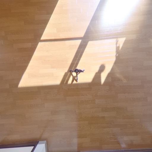 採光の良さ(確度88%):大きめの掃き出し窓から強い日差しが入り、室内全体が明るい。床にくっきりと日光の影が出ている。