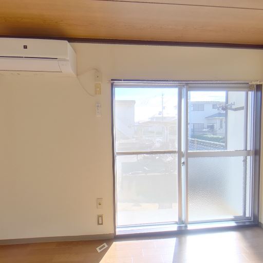 エアコン設置済み(確度95%):壁上部にエアコン本体が取り付けられている。