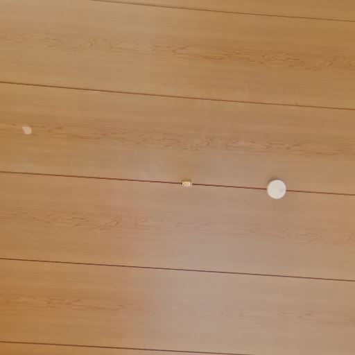 天井設備と仕上げ(確度74%):木目調の天井に火災警報器と照明用配線器具が見える。