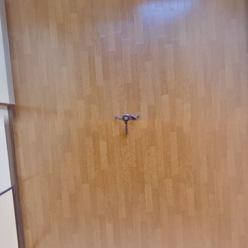 床仕上げの状態(確度72%):フローリング調の床で大きな傷や汚れは見当たらない。中央に床配管キャップのような部材がある。