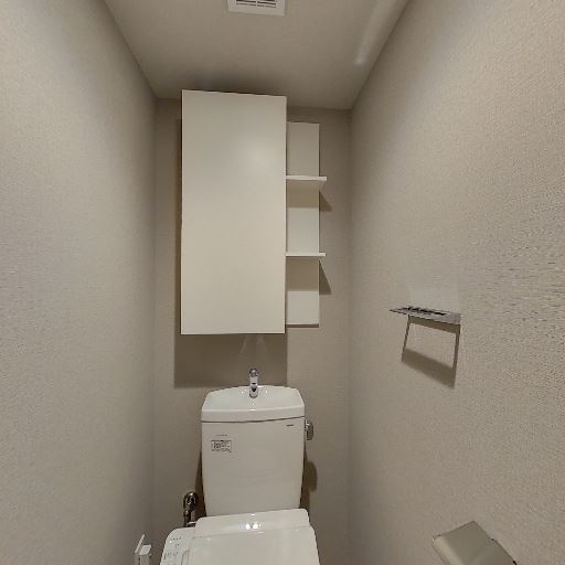 • 収納が充実したトイレ空間(確度87%):便器前方の壁面に吊戸棚とオープン棚があり、トイレットペーパーや掃除用品を十分に収納できそう。