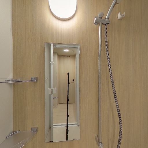 • 浴室であること(確度95%):浴槽・シャワー・鏡・シャンプー棚・浴室乾燥機(天井換気)が見えるため、ここはユニットバスと判断できる。