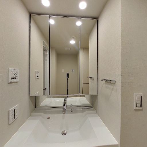 • 三面鏡付きの独立洗面台(確度86%):大きな三面鏡と広めのスクエアボウル、シングルレバー水栓が確認できる。鏡裏収納の可能性が高い。