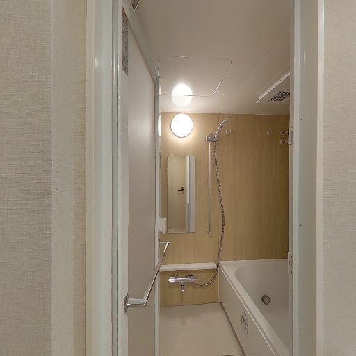 • 脱衣所との導線(確度74%):浴室ドアの外に洗面台と脱衣所が続いているのが見える。動線はシンプル。