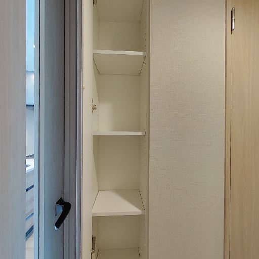 • 廊下の収納スペース(確度83%):可動棚の付いた縦長の収納があり、掃除用具や日用品のストックを整理できそう。内部・扉の状態も良好に見える。