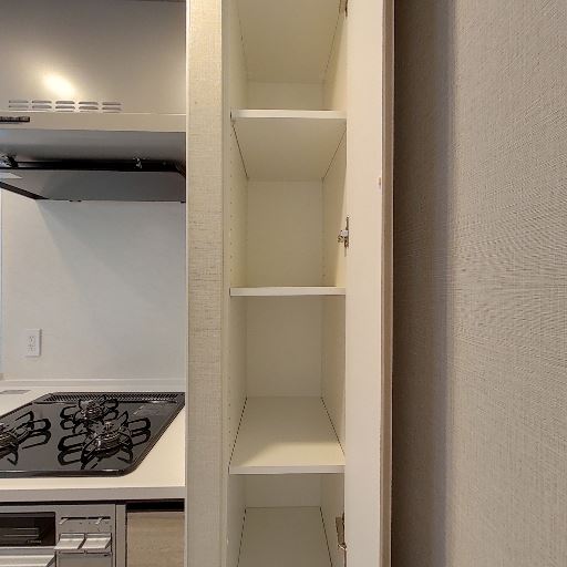 • キッチンの収納量(確度86%):コンロ横に縦長の可動棚があり、調味料や乾物の収納に使えそう。