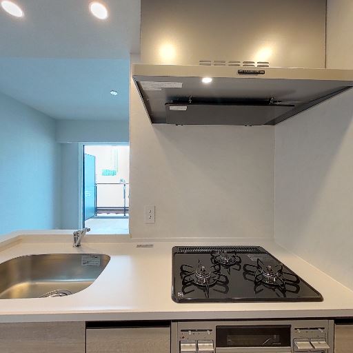 • キッチン設備が新しめで清潔(確度86%):三口ガスコンロと整流板付きレンジフード、シンクも汚れが少なく天板が広い。