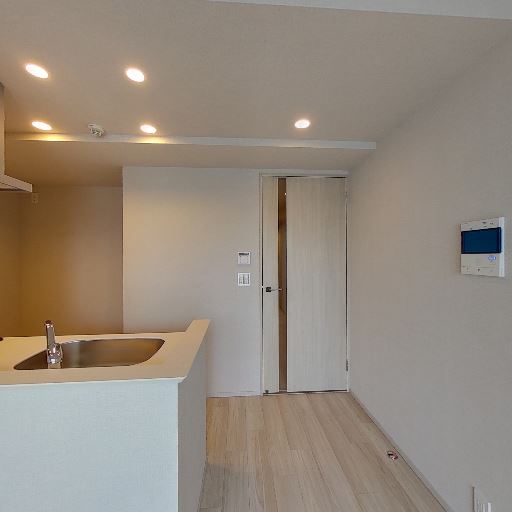 • キッチンは対面カウンター(確度81%):小型の対面型シンクとダウンライトがあり、リビング側に開けた配置。
