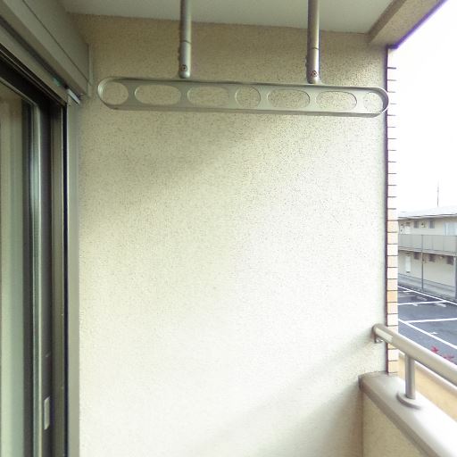 • バルコニーに物干し金具が設置されている(確度96%):天井付近から吊り下がるタイプの物干し金具が確認でき、洗濯物を干すための設備が備わっている。