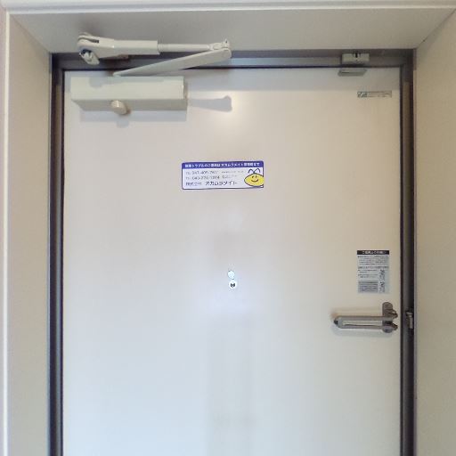 • 玄関扉はしっかりした設備感がある(確度85%):玄関扉にドアクローザー、覗き穴、レバーハンドルが見え、一般的な賃貸として必要な設備は揃っている。