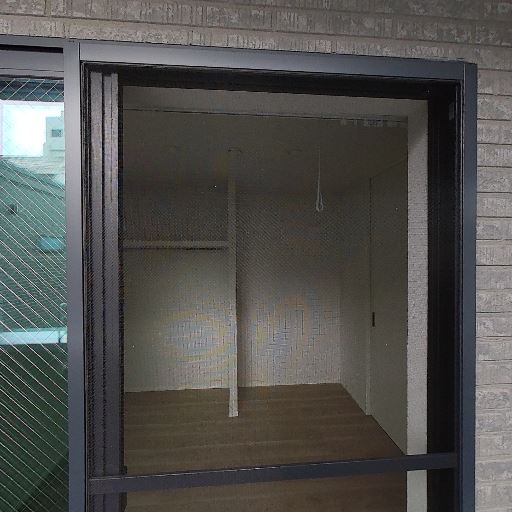 バルコニー付きの掃き出し窓(確度90%):大きなガラス戸の先にバルコニーがあり、エアコン室外機が見える。