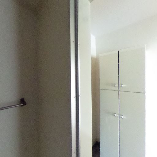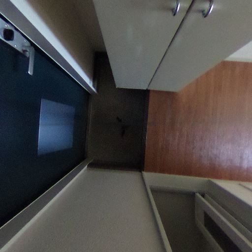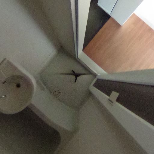 収納・脱衣スペース近接(確度70%):浴室の外に背の高い収納棚とフローリング床が見え、脱衣所〜廊下に繋がる配置。