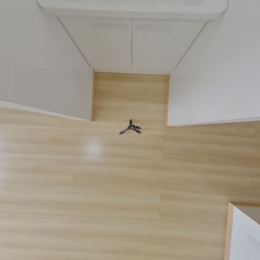 床の状態(確度70%):フローリングは明るい色味で大きな傷や汚れは見当たらない。中央に床用フック(ハンガー)が置かれている。