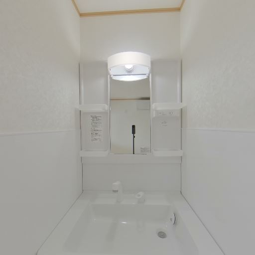 独立洗面台あり(確度90%):ミラー付きの独立洗面台と上部照明、左右に小物棚が確認できる。