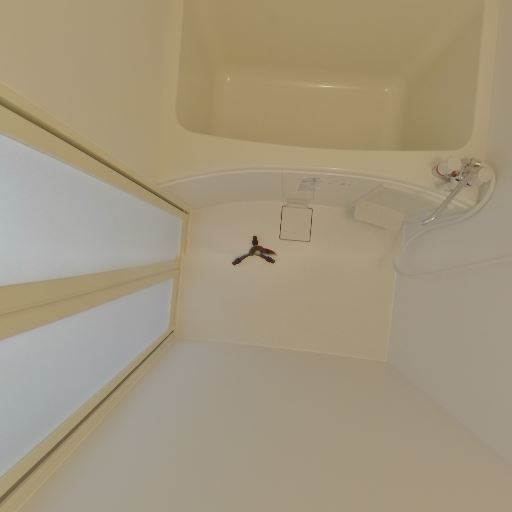 浴室である(確度96%):浴槽・シャワーヘッド・浴室用換気乾燥機の吸気口、すりガラスの引き戸が見える。