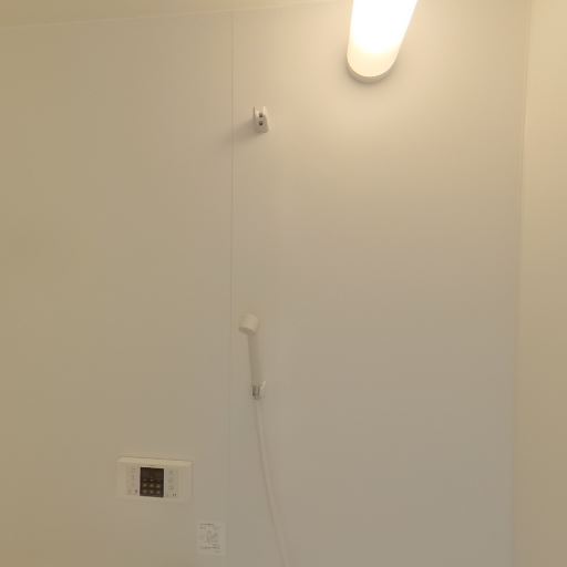 設備と機能(確度83%):温水洗浄便座用の操作リモコンが便座横に見える。天井にダウンライトと換気口あり。