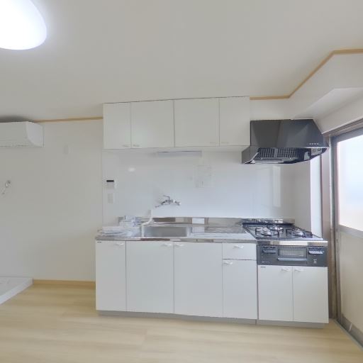 キッチンの充実度(確度87%):壁付けのキッチンは吊戸棚・換気フード・3口コンロとグリル付きで、調理スペースも確保されている。