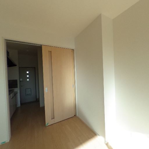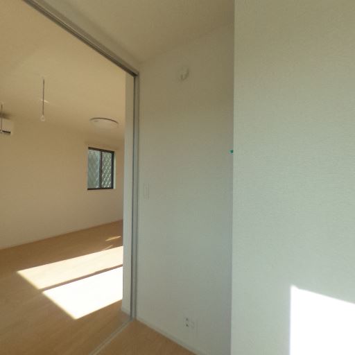 キッチン・玄関が近い間取り(確度80%):引き戸の先にキッチンと玄関扉が見え、居室と直結している。
