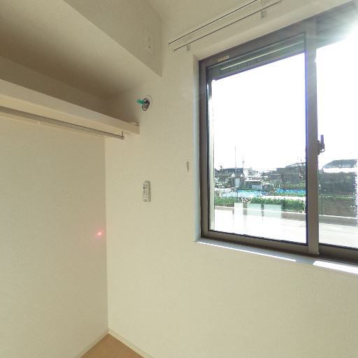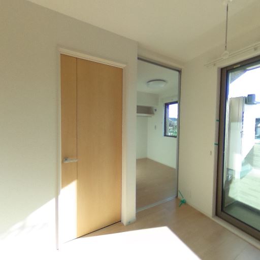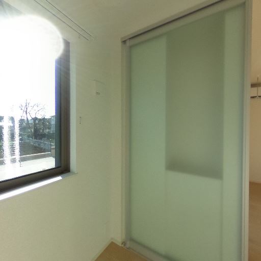 バルコニー付き(確度86%):掃き出し窓の外に手すりと床面が見え、バルコニーが確認できる。