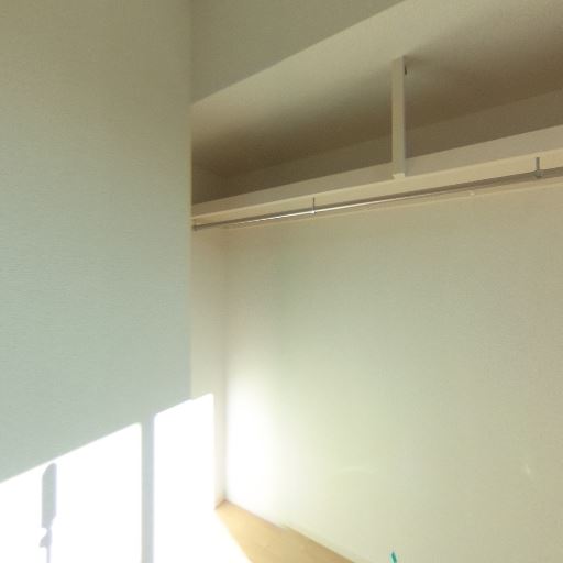 オープンクローゼット(ハンガーパイプ)(確度83%):壁面に長いハンガーパイプと上部棚があり、衣類を掛けて収納できる。