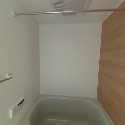 バスタブ・追い焚きリモコン(確度73%):浴槽が標準サイズで、壁面に浴室用リモコンが見える。追い焚きや温度調整が可能そう。