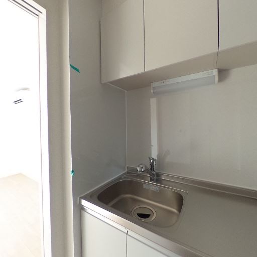 単身向けのコンパクトなキッチン(確度79%):シンク一体型のステンレス天板と1口〜2口想定のコンロスペース。吊り戸棚と下部収納があり、作業スペースはやや狭め。