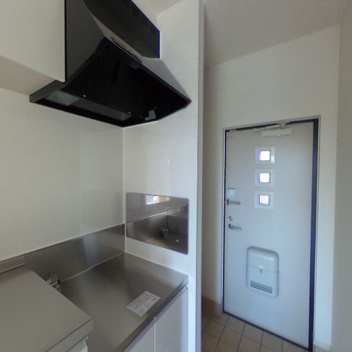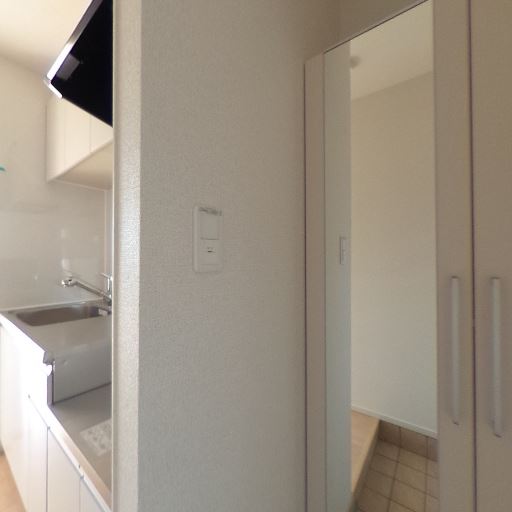 キッチンが玄関近接(確度86%):シンクや吊戸棚が玄関スペースのすぐ隣に配置されている。