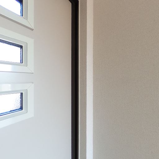 玄関ドアの採光窓(確度78%):玄関ドアに小窓が複数あり、明るさを取り込みつつ目隠しガラスでプライバシーに配慮されている。