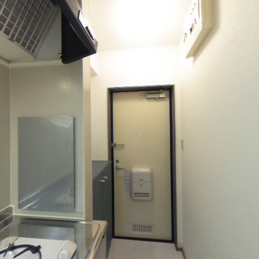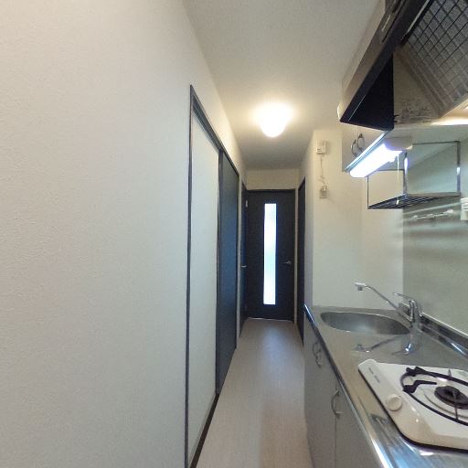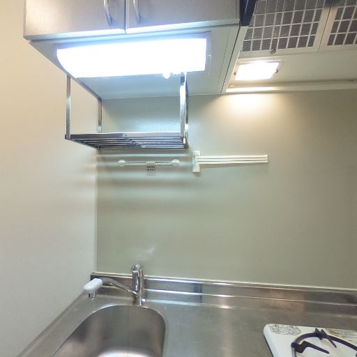 キッチンは細長い廊下型(確度86%):シンクとコンロが一直線の単身向けミニキッチンで、通路幅はやや狭め。レンジフードと吊り棚、作業灯がある。