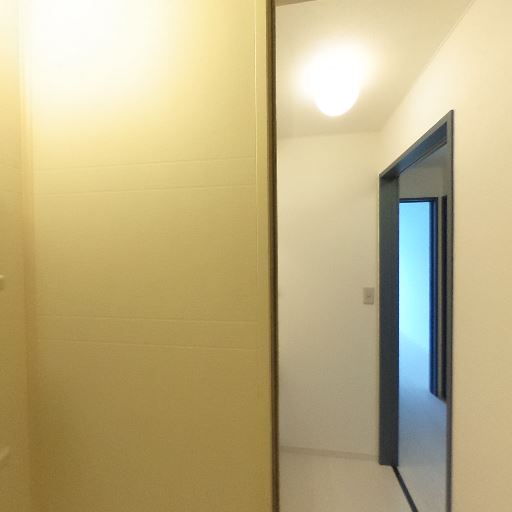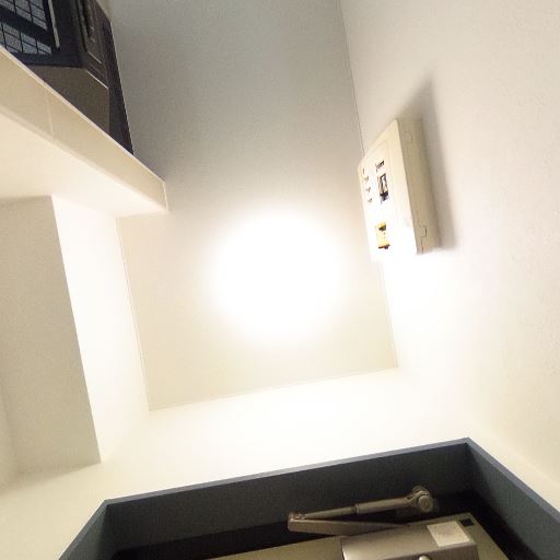 玄関ドアと防犯性(確度84%):玄関は内開きでドアスコープ、ドアチェーン(補助ロック)が確認できる。ドアクローザーも設置されている。