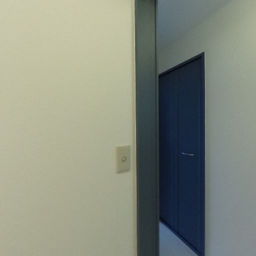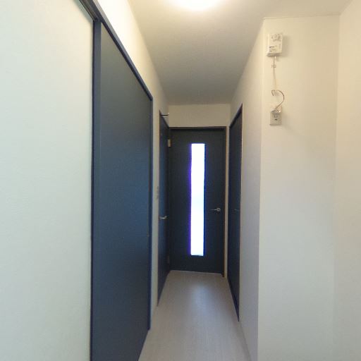 廊下収納(クローゼット)らしき扉(確度70%):廊下側に背の高い収納扉があり、物入れまたはクローゼットが期待できる。