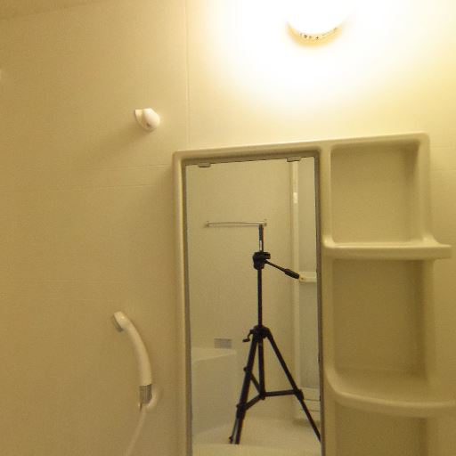 浴室内収納と鏡(確度83%):洗い場側に縦型の棚と鏡があり、洗面小物を置ける。