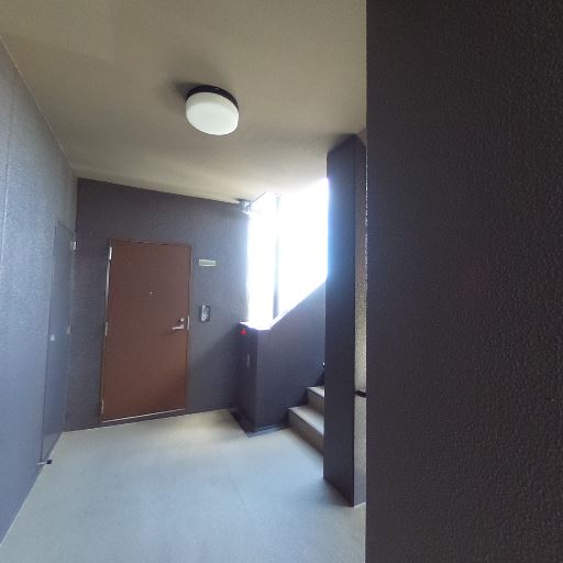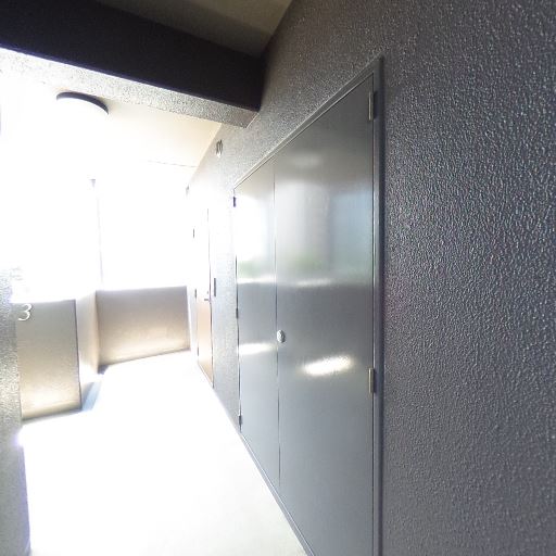 防火設備の設置(確度73%):共用部壁面に消火器収納ボックスが確認できる。