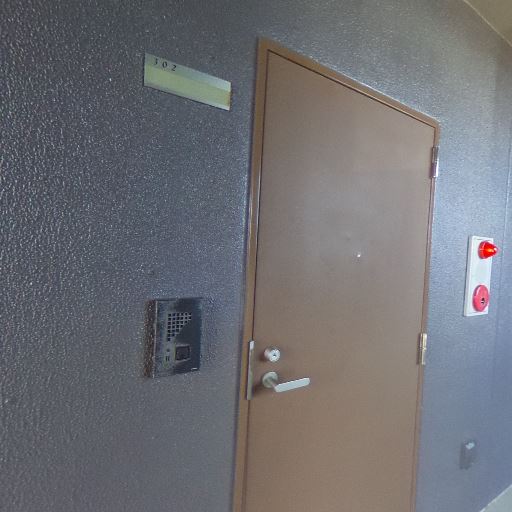 玄関扉とインターホンの位置(確度78%):居室の玄関扉の横にインターホンと表札スペースが見える。