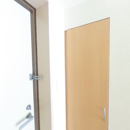 洗面室が玄関近くに配置(確度69%):玄関からすぐの位置に洗面・脱衣所の扉が見える。帰宅後の手洗い動線は良い反面、プライバシーに注意が必要。