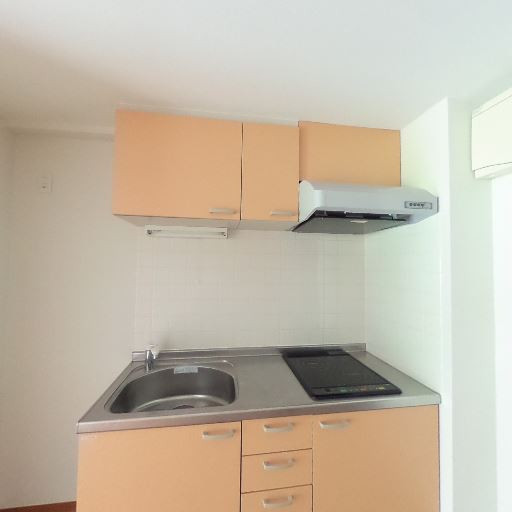 キッチンの状態と設備(確度86%):単身者向けサイズのシンクとIHコンロ一体のコンパクトキッチン。吊戸棚・レンジフード・小引き出しあり。清潔感はある。