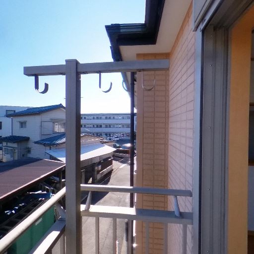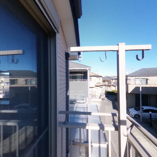 バルコニーの物干し設備(確度90%):手すりに固定された複数フック付きの物干し金具が左右に設置されている。