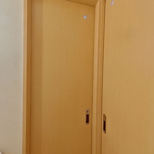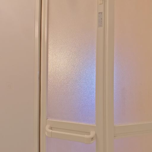 出入口は引き戸タイプ(確度78%):すりガラスの引き戸が確認でき、外からの視線は遮れる。